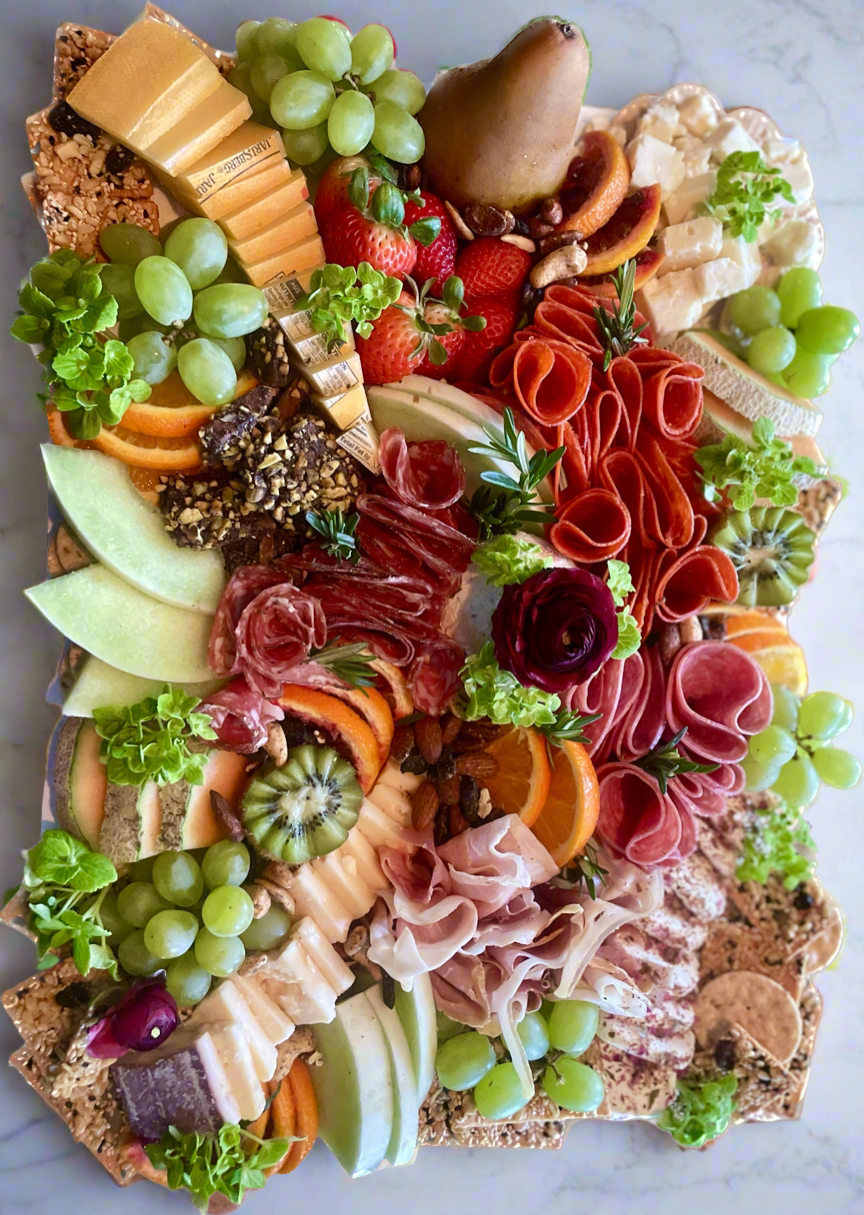 With its large size and luxurious design, the Majestic size boxed board adds a sophisticated touch to your charcuterie spreads and event. Carefully curated and sourced with an array of gourmet foods; four quality meats, five European cheeses, spreads, mixed olives, premium crackers, an assortment of farm fresh dry and sensual fruits with layers of sweets and treats. Offering a tasteful presentation, this charcuterie board is the perfect way to enjoy your favorite cheeses, cold cuts, and fruits in style.