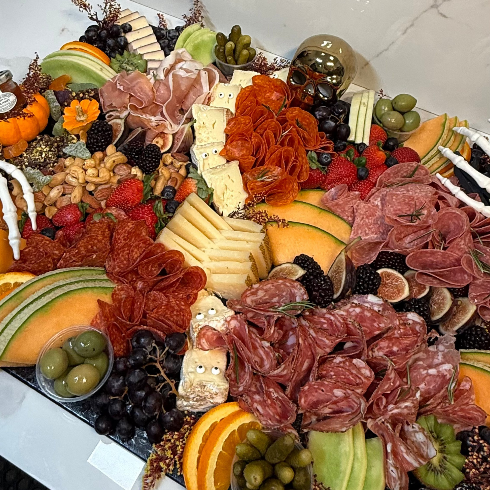 A spooky twist with just the right touch — this charming board features a curated mix of six seasonal cheeses and five meats , fruits, and festive treats in Halloween hues. Served with your very own ceramic skull (yours to keep!) and fun skeleton hands for a playful touch — note, they’re just for decoration and not edible. Hands included.