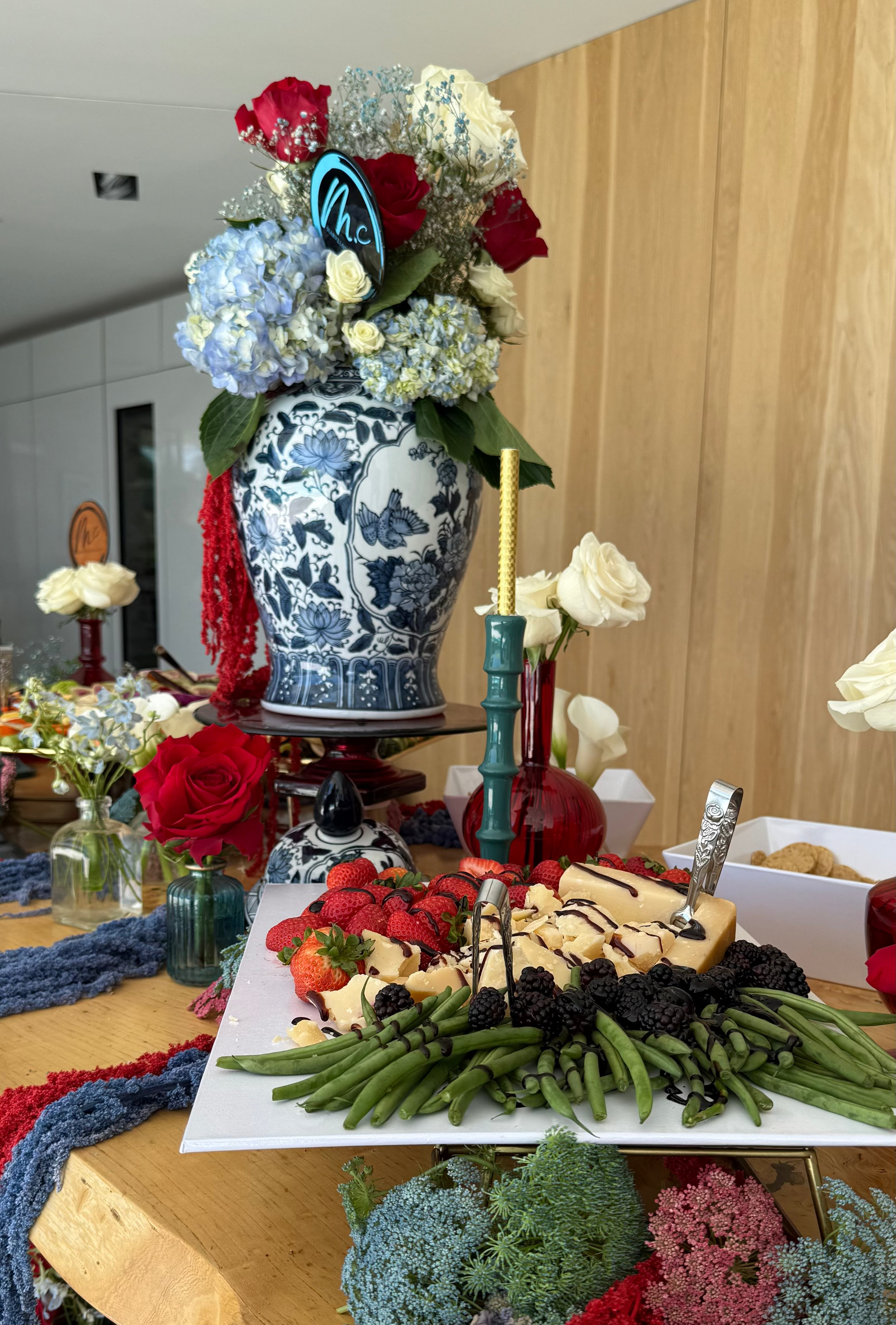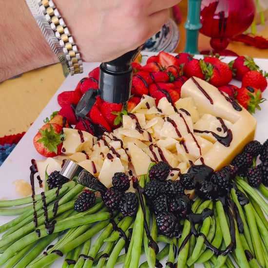 The board is paired with fresh strawberries, crisp green beans, blackberries and seasonal cranberries, adding bright, vibrant notes that balance the depth of the cheese. Drizzle with balsamic just before serving to elevate the entire experience with a glossy, tangy finish.